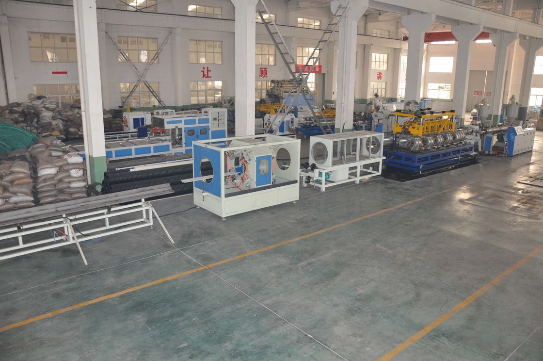 기계 → 절단기에서 떨어져 machine→ 견인을 형성하는 die→를 형성하는 PVC material→ 파이프 압출 다이 + 파형관을 위한 PE / PP 자재 / 쌍축 스크류 압출기를 위한 원료 + 첨가제 → 혼합 → 진공 급송기 → 호퍼 드라이어 → 단일의 스크류 압출기